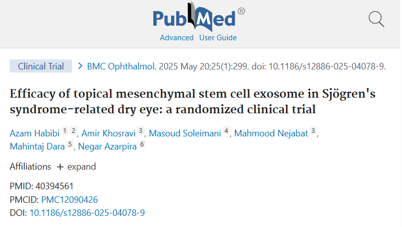 2025年5月28日發表在《BMC Ophthalmology》期刊的研究《HWJMSC外泌體滴眼液顯著改善干燥綜合征相關干眼癥狀和淚膜穩定性》,臨床結果顯示,使用外泌體滴眼液的治療組在以下方面均有顯著改善:眼表疾病指數(OSDI) 評分下降,淚液分泌量(Schirmer試驗)增加,角膜熒光素染色評分降低。