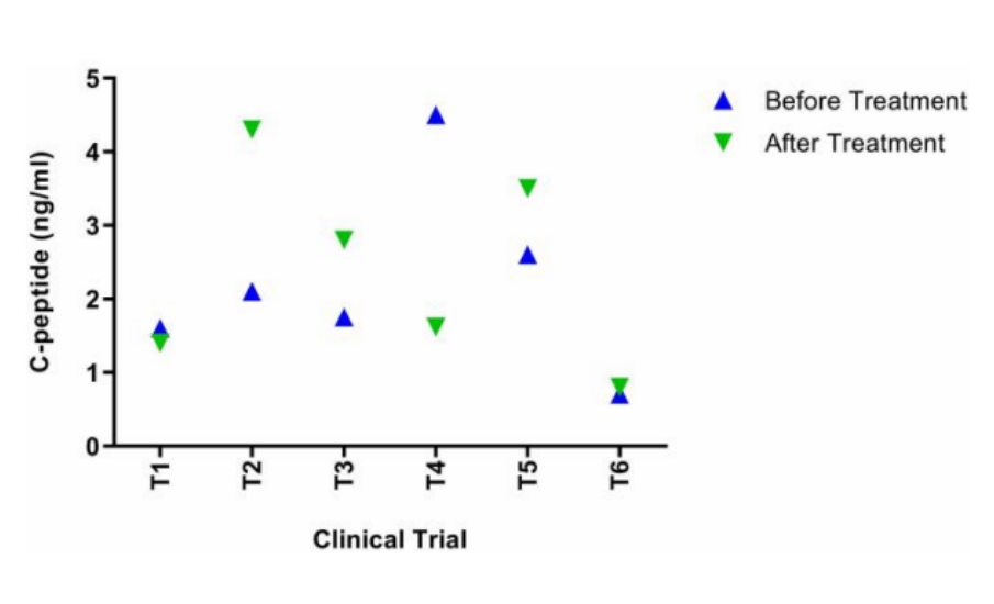 根據研究試驗,使用間充質干細胞干預Ⅱ型糖尿病,胰島素抵抗和胰島素依賴性減少。此外,HbAc1和FBG水平的顯著降低提示肝功能得到改善。這些試驗還顯示,在2個試驗(T1和T4)中,c肽水平下降到正常水平,這表明體內負責胰島素抵抗的胰島細胞有所改善。其他四個試驗(T2、T3、T4和T5)顯示c肽水平升高。