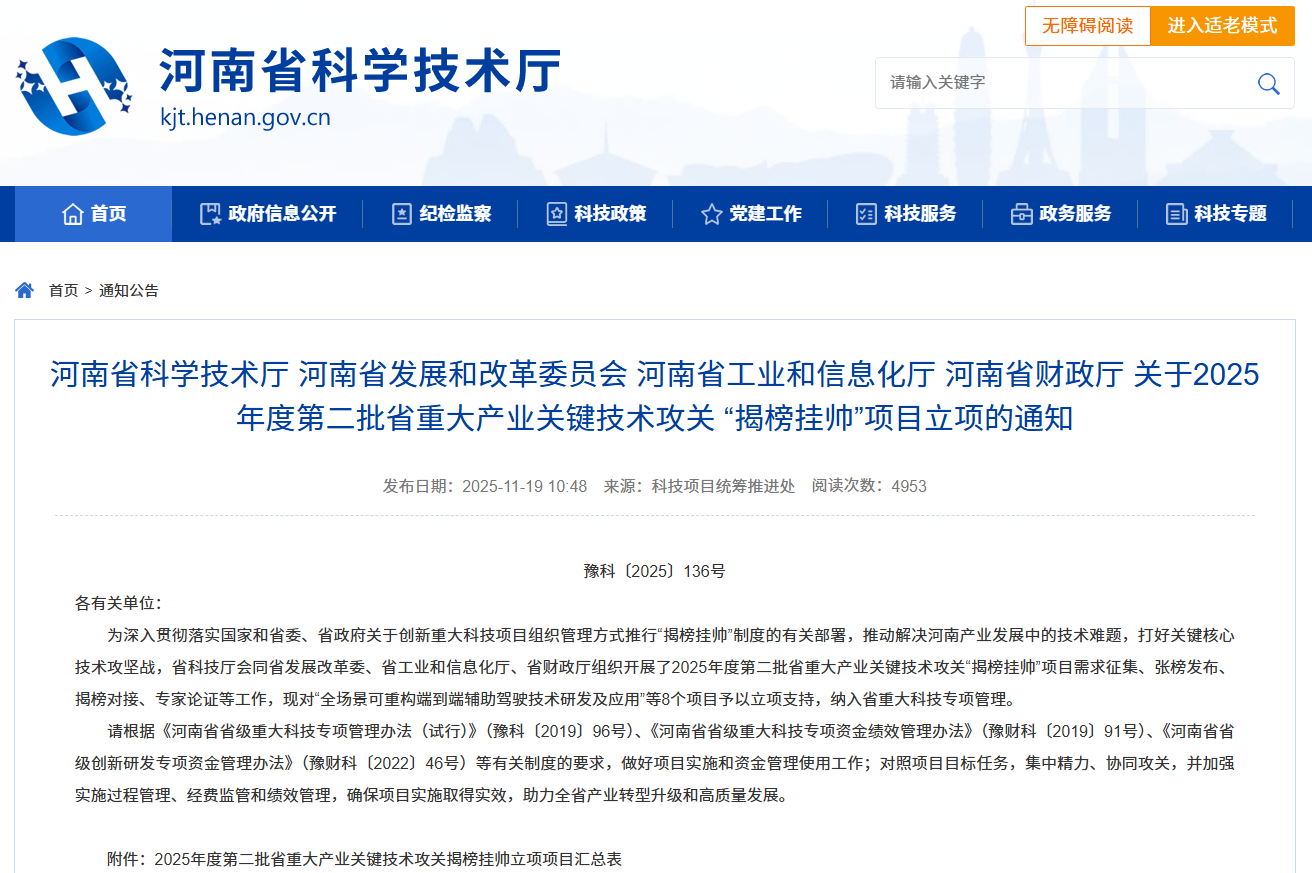 (圖為河南省科技廳關于2025年度第二批省重大產業關鍵技術攻關“揭榜掛帥”項目立項的通知)