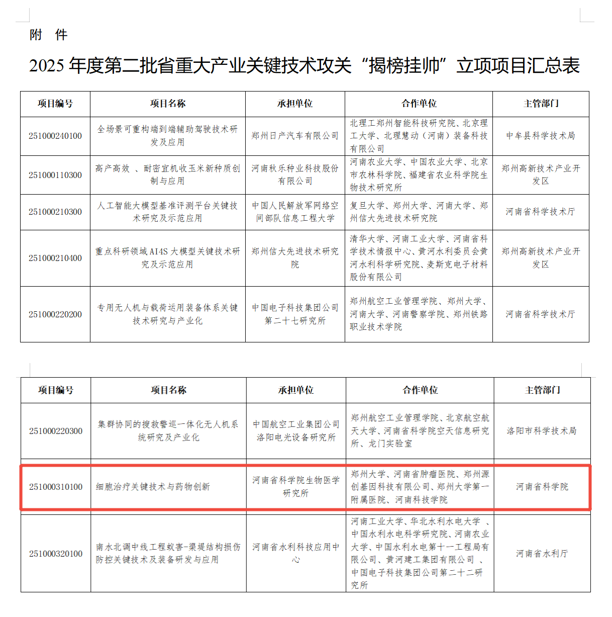 (圖為2025年度第二批省重大產業關鍵技術攻關“揭榜掛帥”立項項目:“細胞治療關鍵技術與藥物創新”)