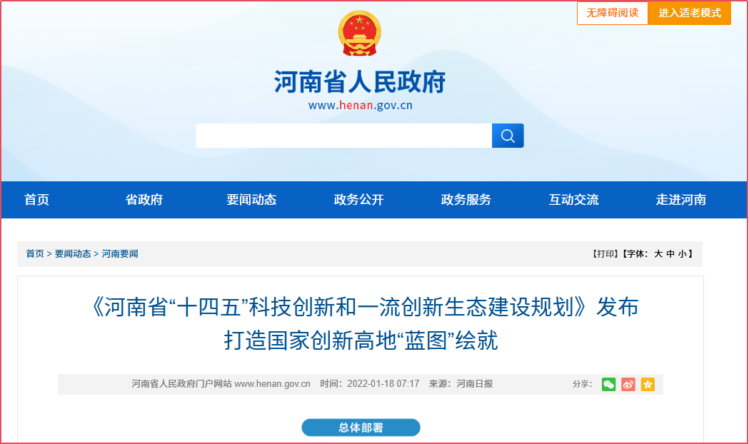 (圖為《河南省“十四五”科技創新和一流創新生態建設規劃》政策發布截圖)