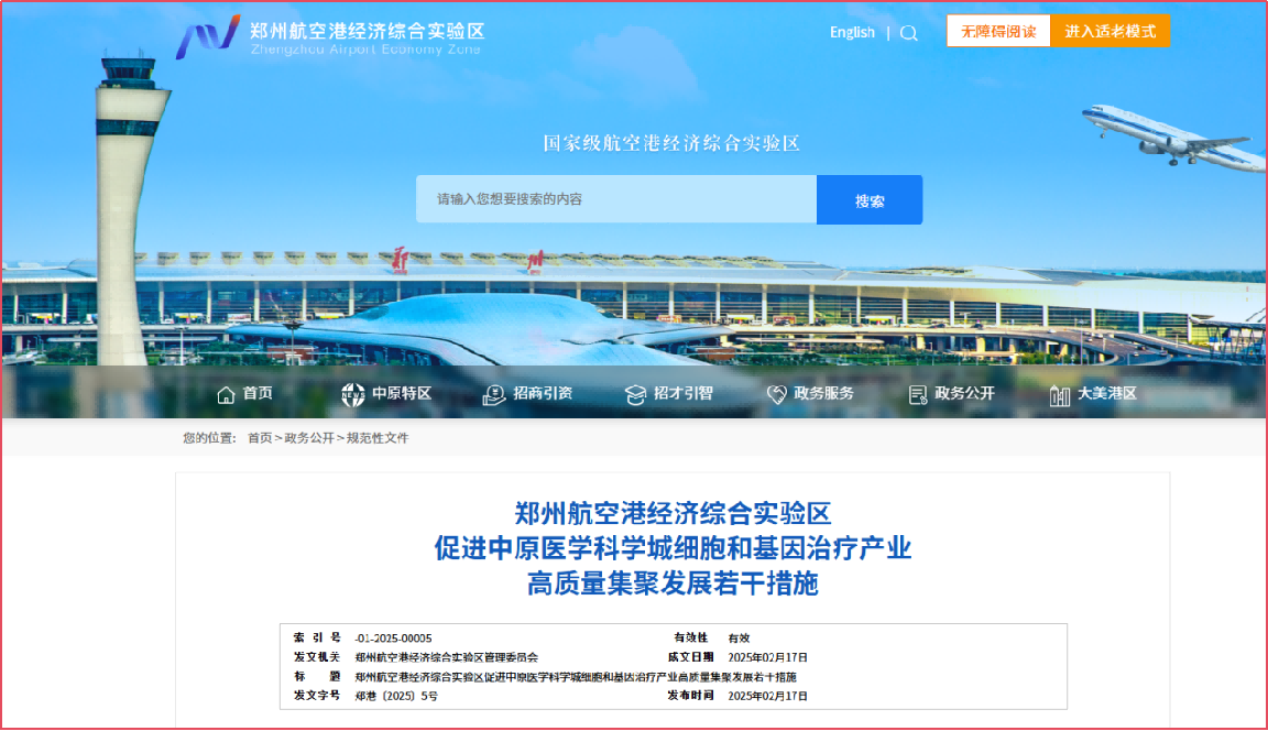 (圖為《鄭州航空港區促進中原醫學科學城細胞和基因治療產業高質量集聚發展若干措施》政策發布截圖)
