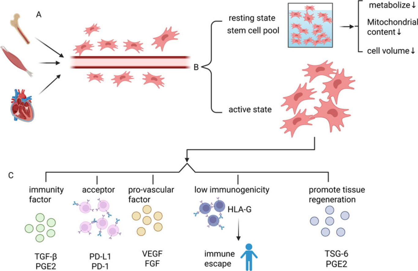 MSCs可通過分泌轉化生長因子 -β(TGF -β)、前列腺素 E2(PGE2)等因子調節免疫反應,還能借助細胞膜表面的程序性死亡受體配體 1(PD - L1)等分子與免疫細胞相互作用,抑制異常免疫攻擊。此外,MSCs免疫原性較低,移植后不易引發宿主免疫排斥反應。