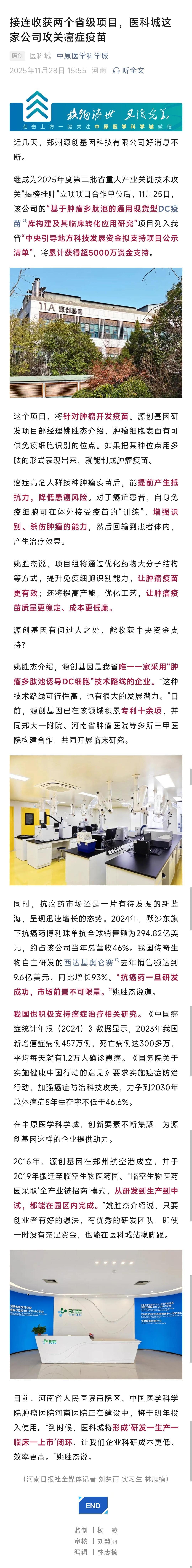 文章重點(diǎn)介紹了源創(chuàng)基因先后獲批省級(jí)“揭榜掛帥”項(xiàng)目及中央引導(dǎo)地方科技發(fā)展資金支持的情況,闡述了公司在“通用現(xiàn)貨型DC疫苗庫(kù)”技術(shù)路徑上的創(chuàng)新突破、臨床合作布局以及在中原醫(yī)學(xué)科學(xué)城產(chǎn)業(yè)生態(tài)下的發(fā)展優(yōu)勢(shì)。