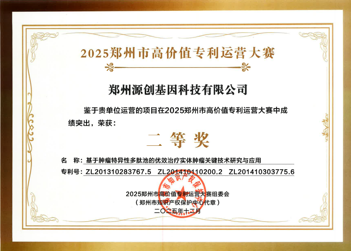 12月3日,由鄭州市市場(chǎng)監(jiān)督管理局(知識(shí)產(chǎn)權(quán)局)主辦,鄭州市知識(shí)產(chǎn)權(quán)保護(hù)中心、鄭州高新區(qū)管委會(huì)承辦的2025年鄭州市高價(jià)值專利運(yùn)營大賽(鄭高賽)決賽圓滿落幕。經(jīng)過激烈角逐與專家評(píng)審,鄭州源創(chuàng)基因科技有限公司參賽項(xiàng)目——“基于腫瘤特異性多肽池的優(yōu)效治療實(shí)體腫瘤關(guān)鍵技術(shù)研究與應(yīng)用”,憑借創(chuàng)新性與應(yīng)用價(jià)值,在決賽中榮獲二等獎(jiǎng)。