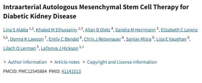 2025年發(fā)表于《腎臟國(guó)際報(bào)告》的臨床研究“Intraarterial Autologous Mesenchymal Stem Cell Therapy for Diabetic Kidney Disease”通過腎動(dòng)脈輸注干細(xì)胞干預(yù)糖尿病腎病被證實(shí)是安全且可行的。并在其中一例病例中,觀察到患者腎功能下降速度有所減緩。